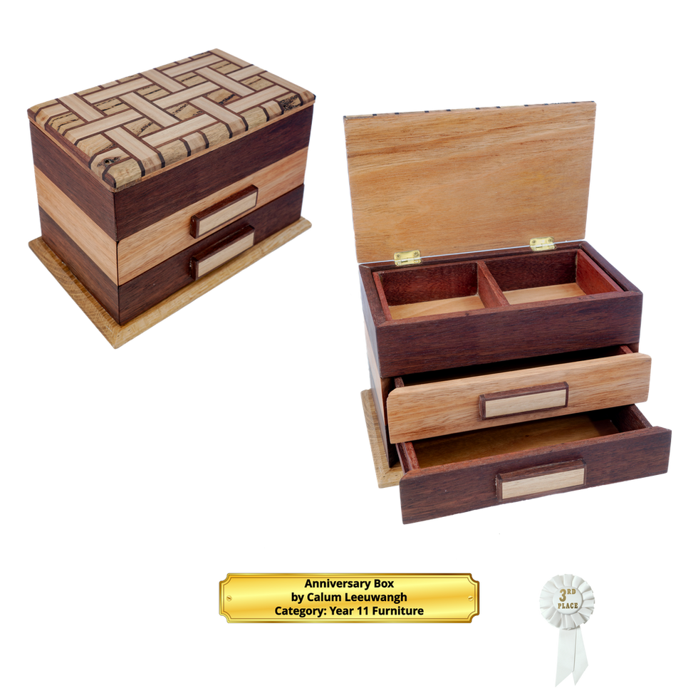 Participation in the Exhibition is open to the public and there were entries from high school students, hobbyists, enthusiasts, and professionals. This year there were 82 entries submitted by 52 exhibitors in nine different categories including Adult Furniture, Boxes, Carving, Year 12 Furniture, Year 11 Furniture, and Embellished Wood Turning. The standard of the entries was exceptional, especially the entries submitted by school students.